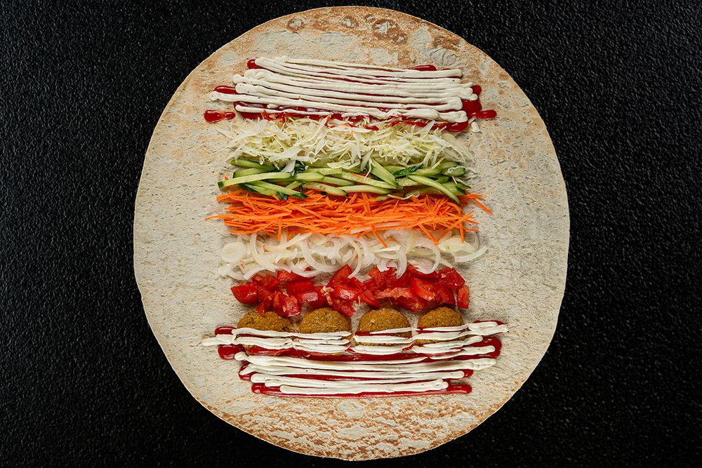Тандырный лаваш, чесночный соус, соус красный сацебели, жаренные шарики из гороха нут, капуста, маринованный лук, маринованная морковь, томаты, огурцы