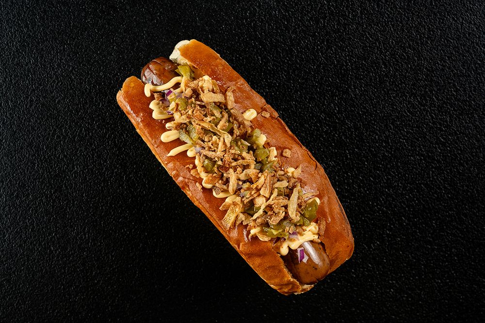 Булочка бриошь, куриная сосиска гриль, фирменный соус спайси, огурцы маринованные, лук маринованный, лук фри