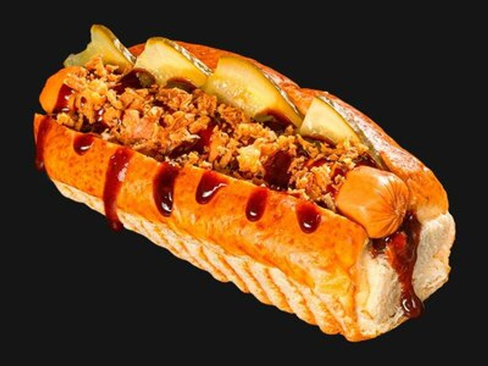 Булочка бриошь, куриная сосиска гриль, соус Барбекю, огурцы маринованные, лук красный, лук фри