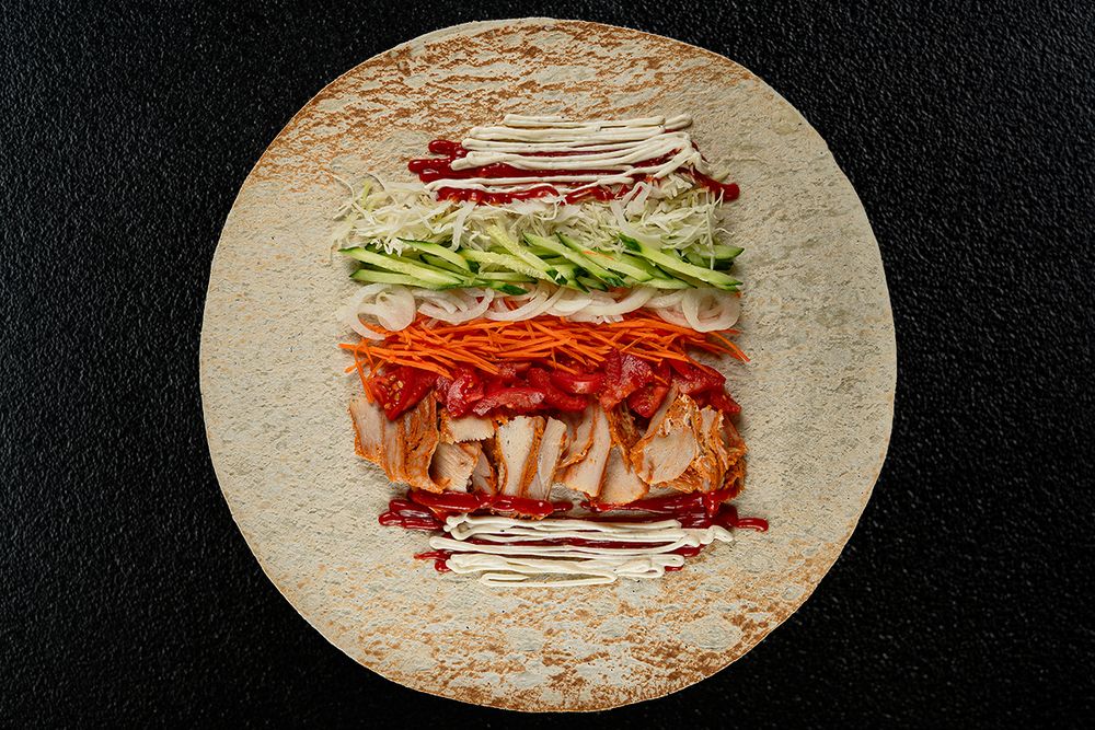 Тандырный лаваш, чесночный соус, соус красный сацебели, жаренная курица, капуста, маринованный лук, маринованная морковь, томаты, огурцы