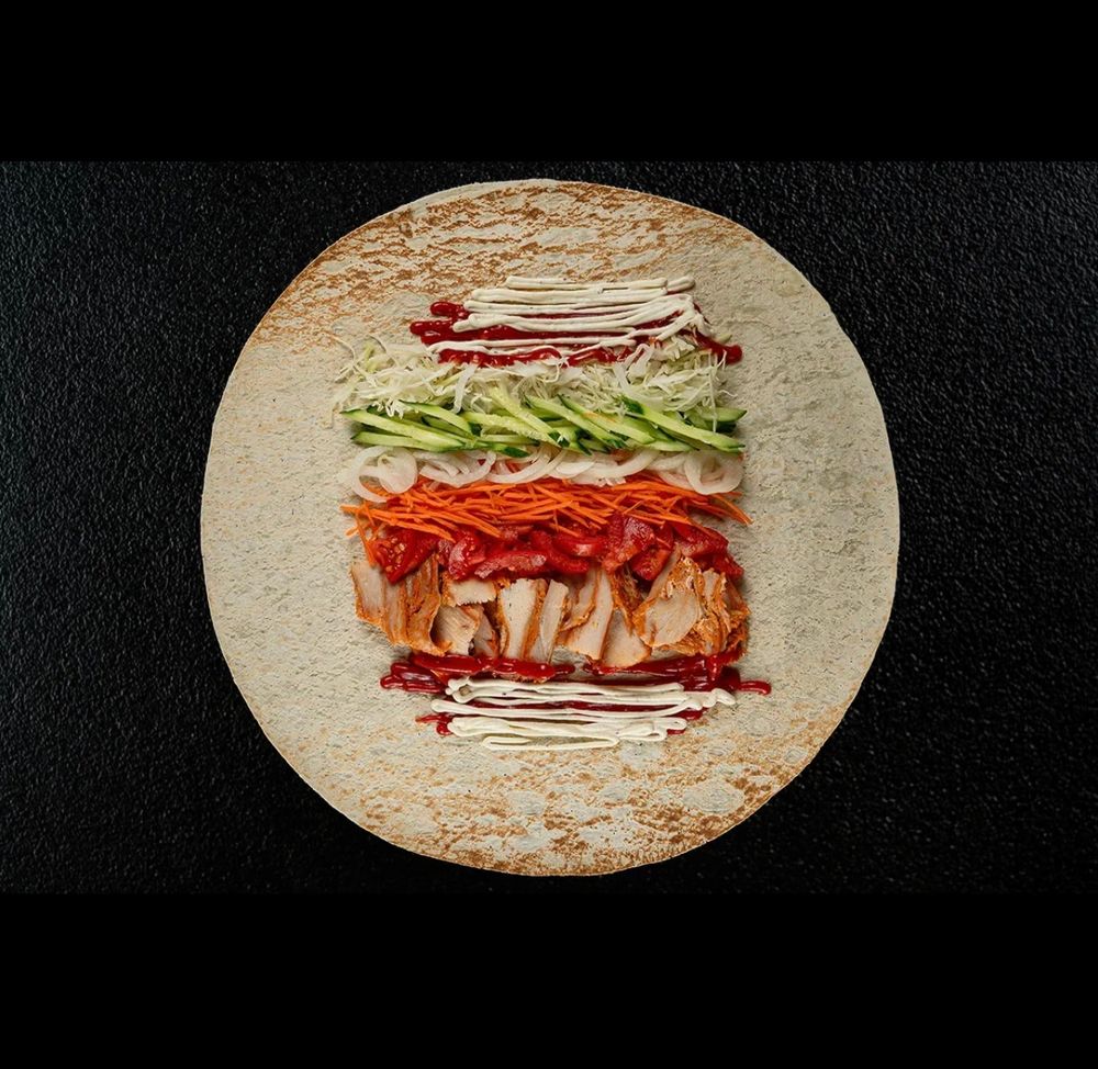 Тандырный лаваш, чесночный соус, соус терияки, жаренная курица, капуста, маринованный лук, маринованная морковь, томаты, огурцы